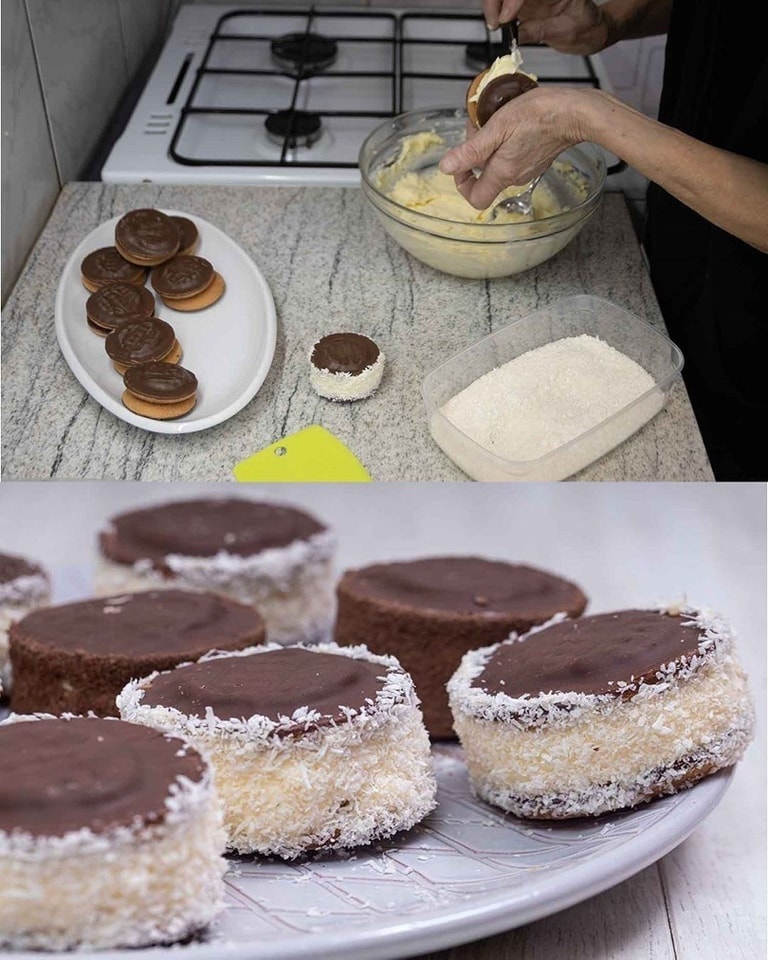 Na jednu stranu kolačića stavite kašiku fila i spojite kolačiće. Poravnajte vanjske ivice kolačića i premažite ih kokosovim brašnom ili čokoladom u prahu.