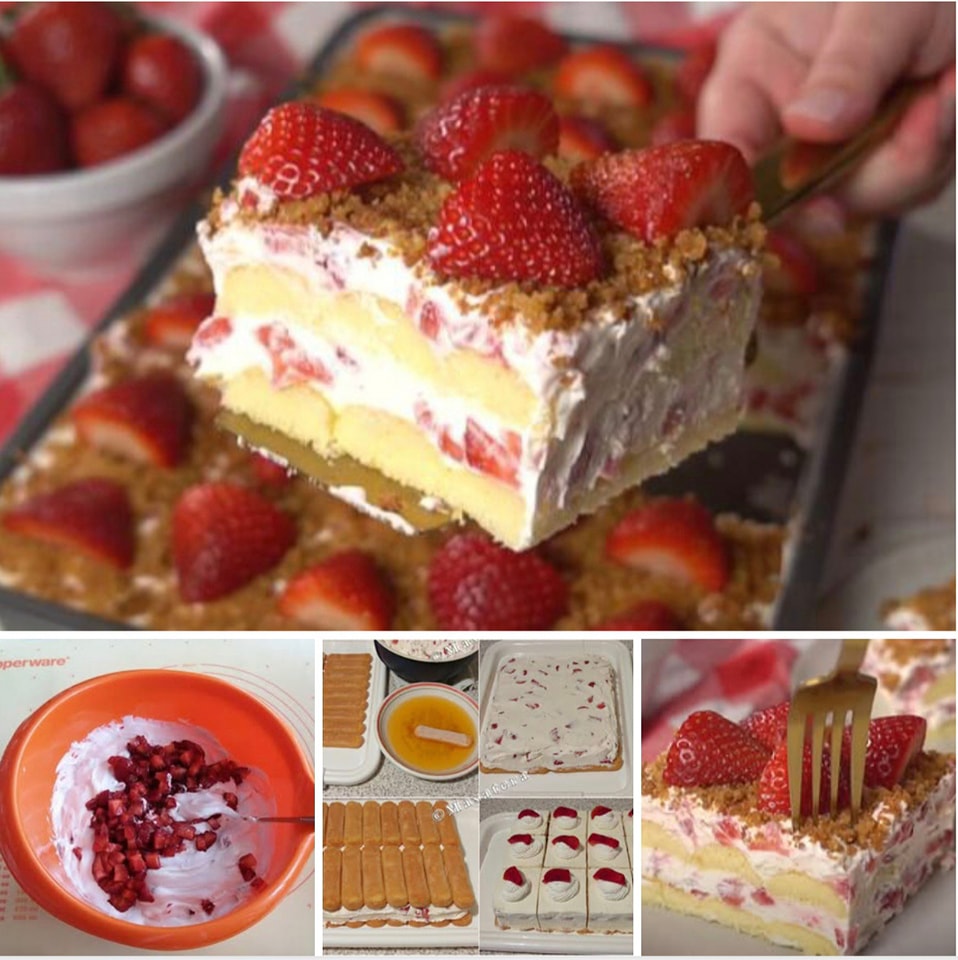 Šećer u prahu i ekstrakt vanile izmiksajte u slatku pavlaku, takođe umutite. Spojite obje smjese i umiješajte jagode. Stavite kekse u kalup i na njega premažite fil.