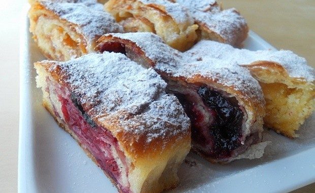 Stavimo u zagrejanu rernu i pecemo na umerenoj temperaturi. Pecenu strudlu kada se prohladi isecemo i pospemo secerom u prahu.