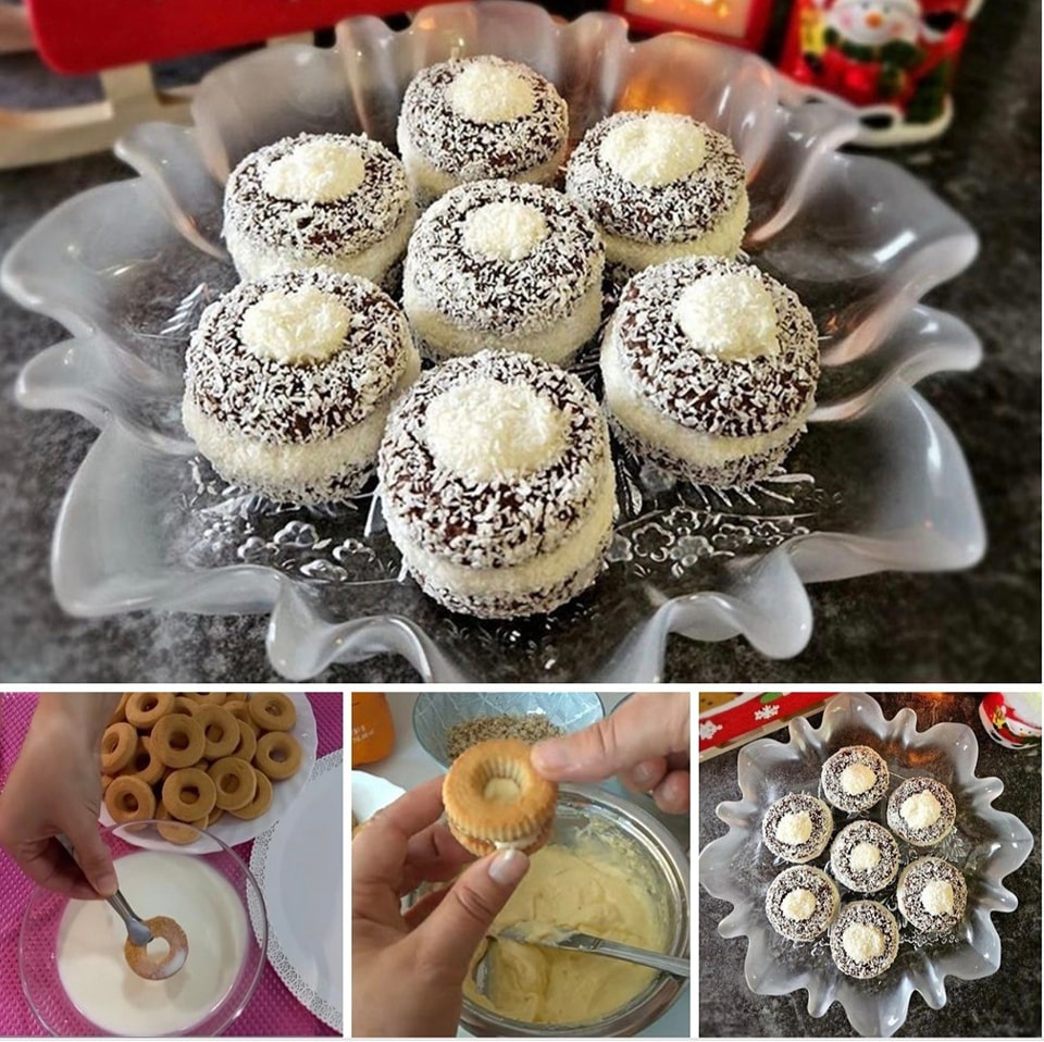 astavite sa nježnim nanošenjem kreme na jedan kolut malom žličicom, zatim ga omotajte drugim kolutom i završite nježnim uvaljanjem u sloj kokosa.