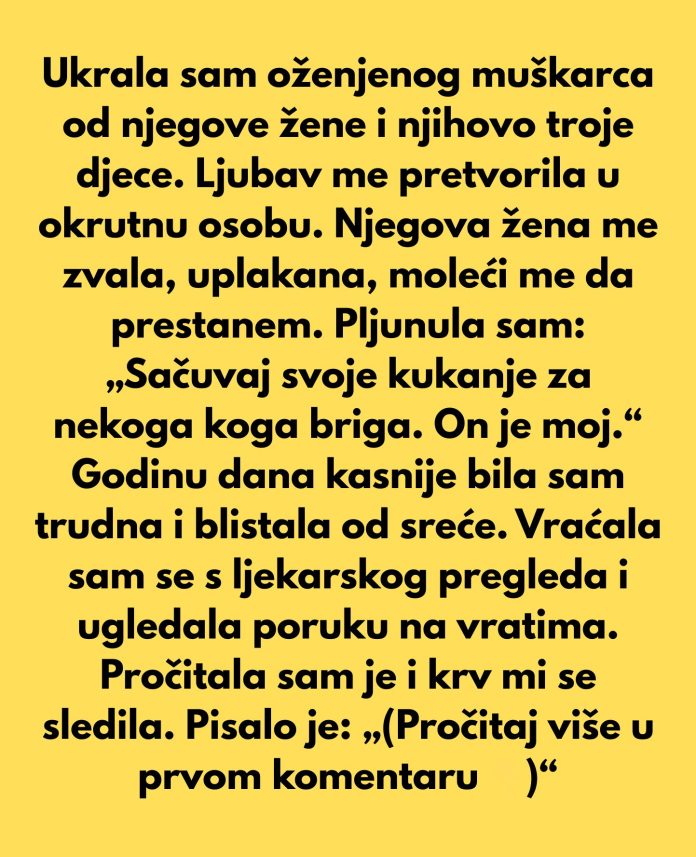 Godinu dana kasnije bila sam trudna i sretna — ili sam barem tako mislila. Vratila sam se kući s pregleda i našla poruku na vratima: „Bježi. Čak ni ti ovo ne zaslužuješ.“ Mislila sam da je to šala ili prijetnja.