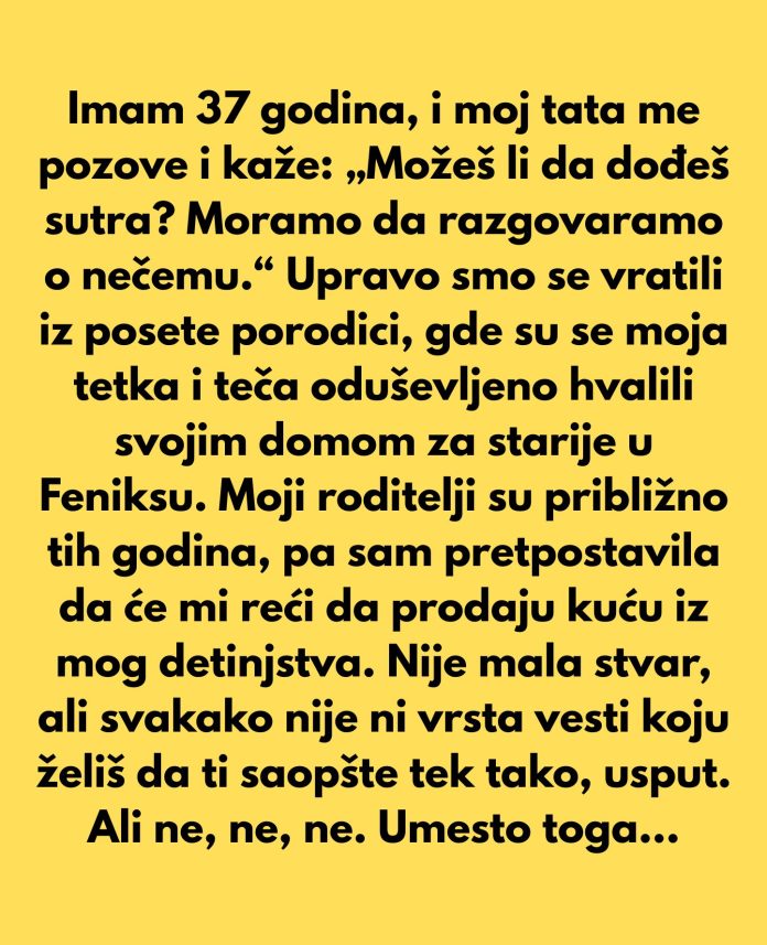 Imam 37 godina, i moj tata me pozove i kaže: „Možeš li da dođeš sutra? Moramo da razgovaramo o nečemu.“ Upravo smo se vratili iz posete porodici, gde su se moja tetka i teča oduševljeno hvalili svojim domom za starije u Feniksu. Moji roditelji su približno tih godina, pa sam pretpostavila da će mi reći da prodaju kuću iz mog detinjstva. Nije mala stvar, ali svakako nije ni vrsta vesti koju želiš da ti saopšte tek tako, usput.
