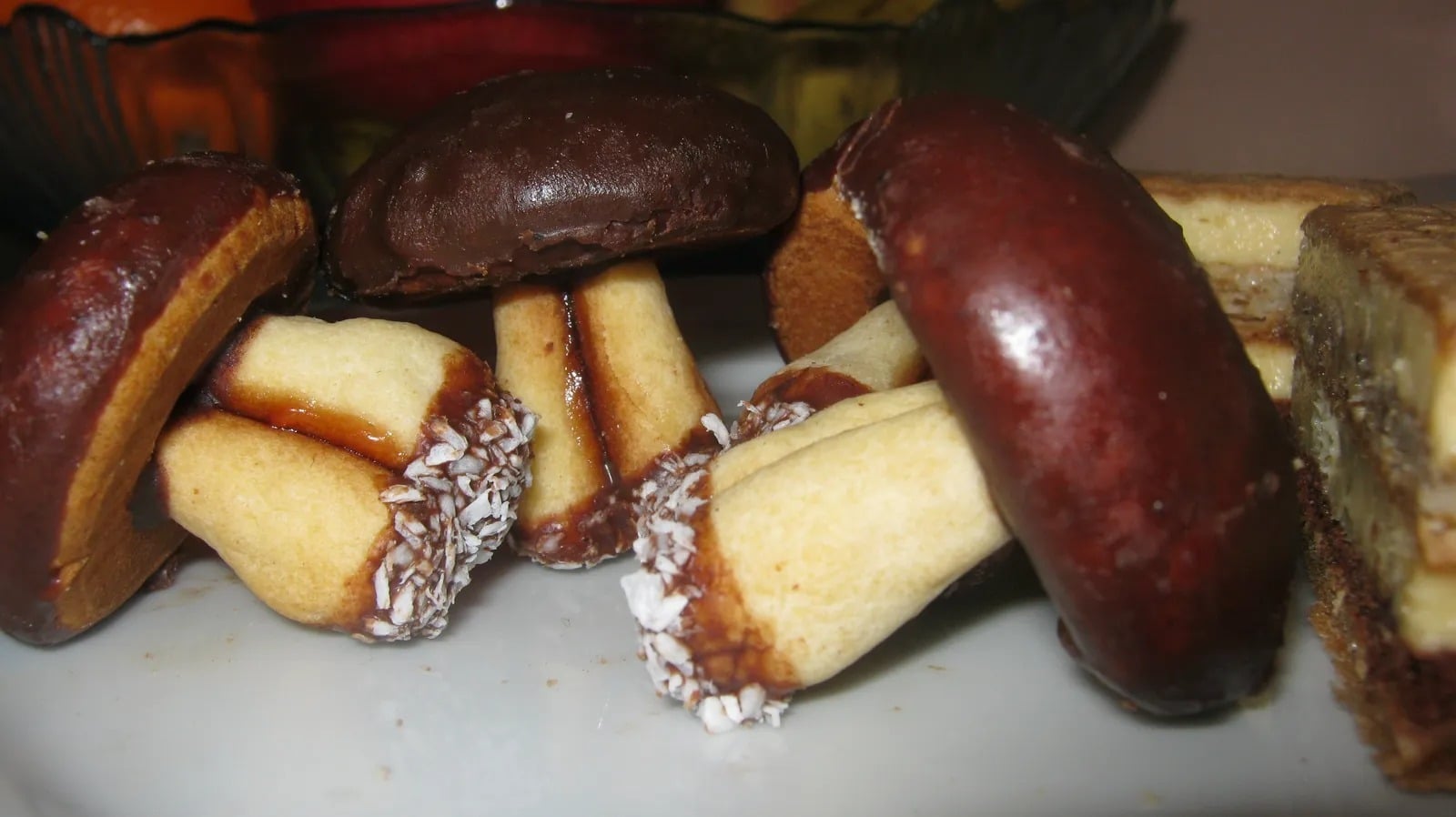 Kad se ohlade peteljke lijepiti marmeladom po dvije, tanje krajeve umakati u otopljenu čokoladu i sastavljati sa kapicama, (ako je potrebno nožem malo proširiti udubljenja).
