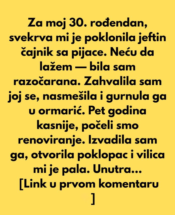 Za moj 30. rođendan, svekrva mi je poklonila jeftin čajnik sa pijace.