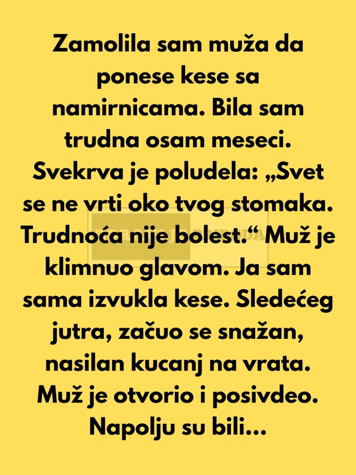 Zamolila sam muža da ponese kese sa namirnicama. Bila sam trudna osam meseci. Svekrva je poludela: „Svet se ne vrti oko tvog stomaka. Trudnoća nije bolest.“ Muž je samo klimnuo glavom. Ja sam sama izvukla kese.Храна