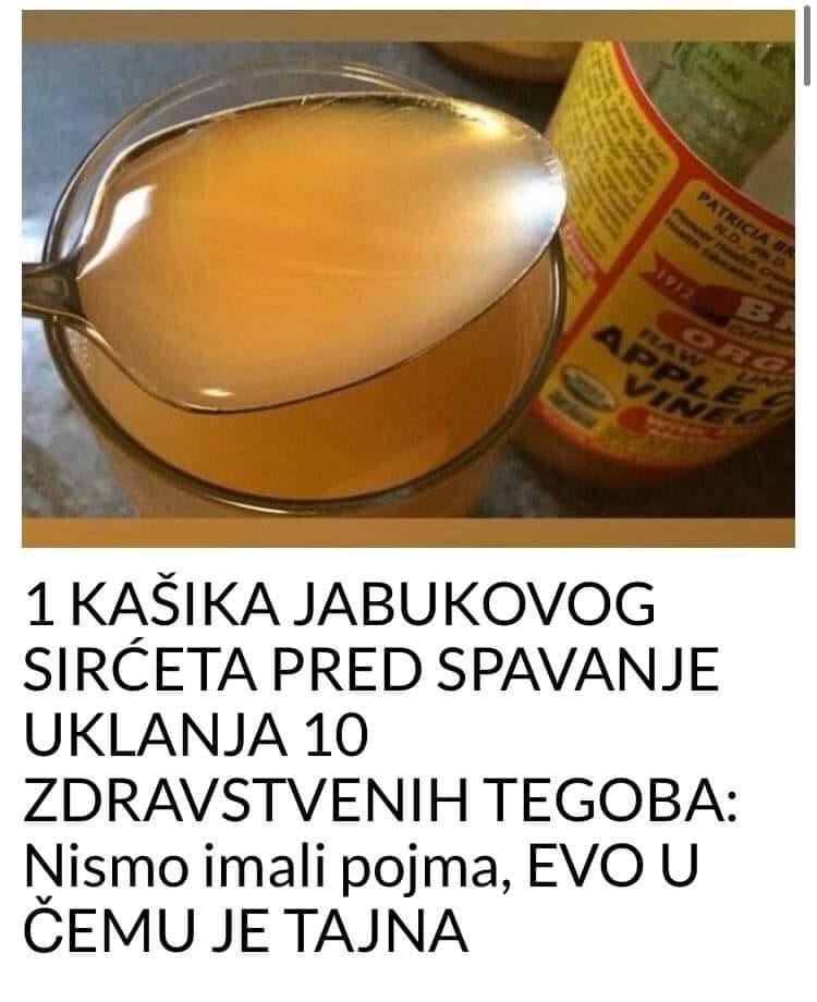Dobra svojstva jabukovog sirćeta jako dobro znamo, ali, postoje i ona koja nisu baš toliko poznata. Pročitati deset dobrih svojstava jabukovog sirćeta koja možete iskoristiti ukoliko popijete jednu kašičicu prije spavanja, i ubrzo će vam vjerovatno postati navika!