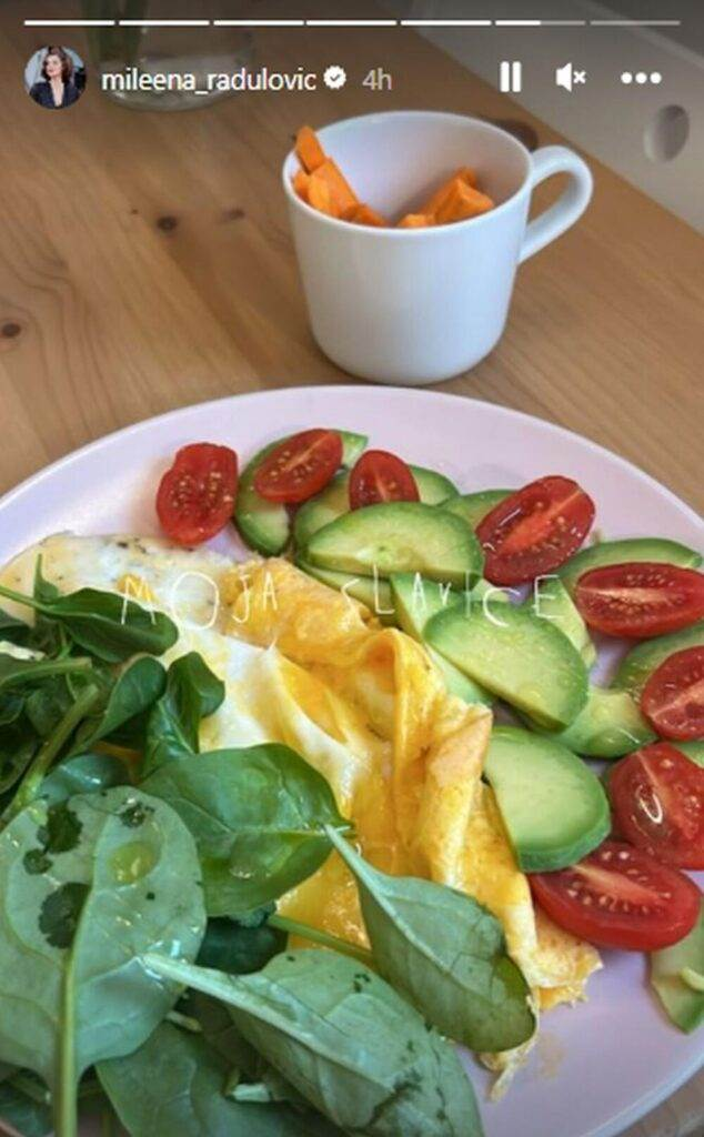 Ona je na Instagramu objavila fotografiju svog doručka koji se sastoji od kajgane, svežeg spanaća, čeri paradajza i avokada. Pored tanjira u šoljici su se našle i iseckane sveže šargarepe.