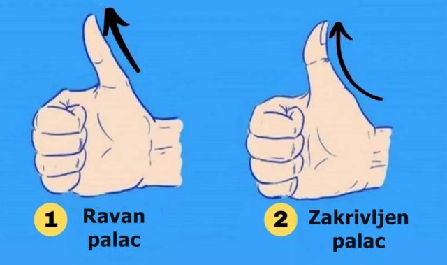 Ako imate zakrivljen palac, vaše osobine ličnosti otkrivaju da ste verovatno emotivna i izražajna osoba. Možda ćete biti dobri u prilagođavanju novim okruženjima i situacijama. Skloni ste da mnogo saosećate sa drugima.